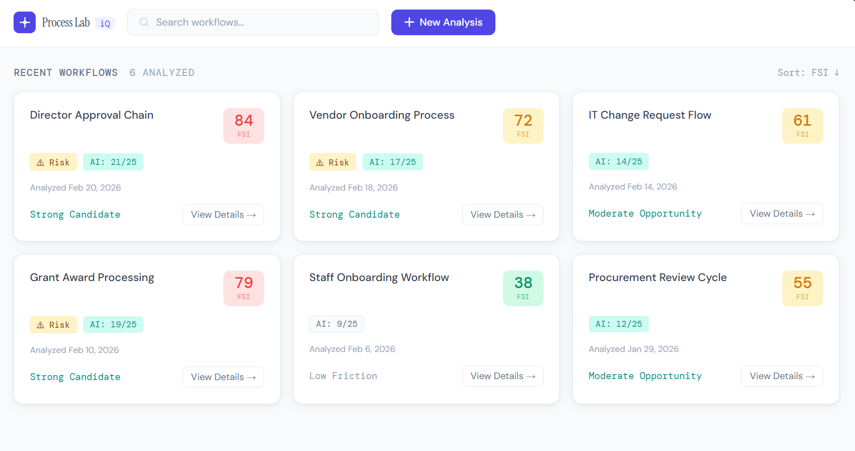 Teams describe process pain in vague terms: "approvals take too long," "there's too much back and forth," "leadership has to sign off on everything." But vague descriptions lead to vague solutions. What's missing is a structured way to decompose a workflow, classify what's actually causing the friction, measure how severe it is, and then test targeted interventions rather than overhauling everything at once.