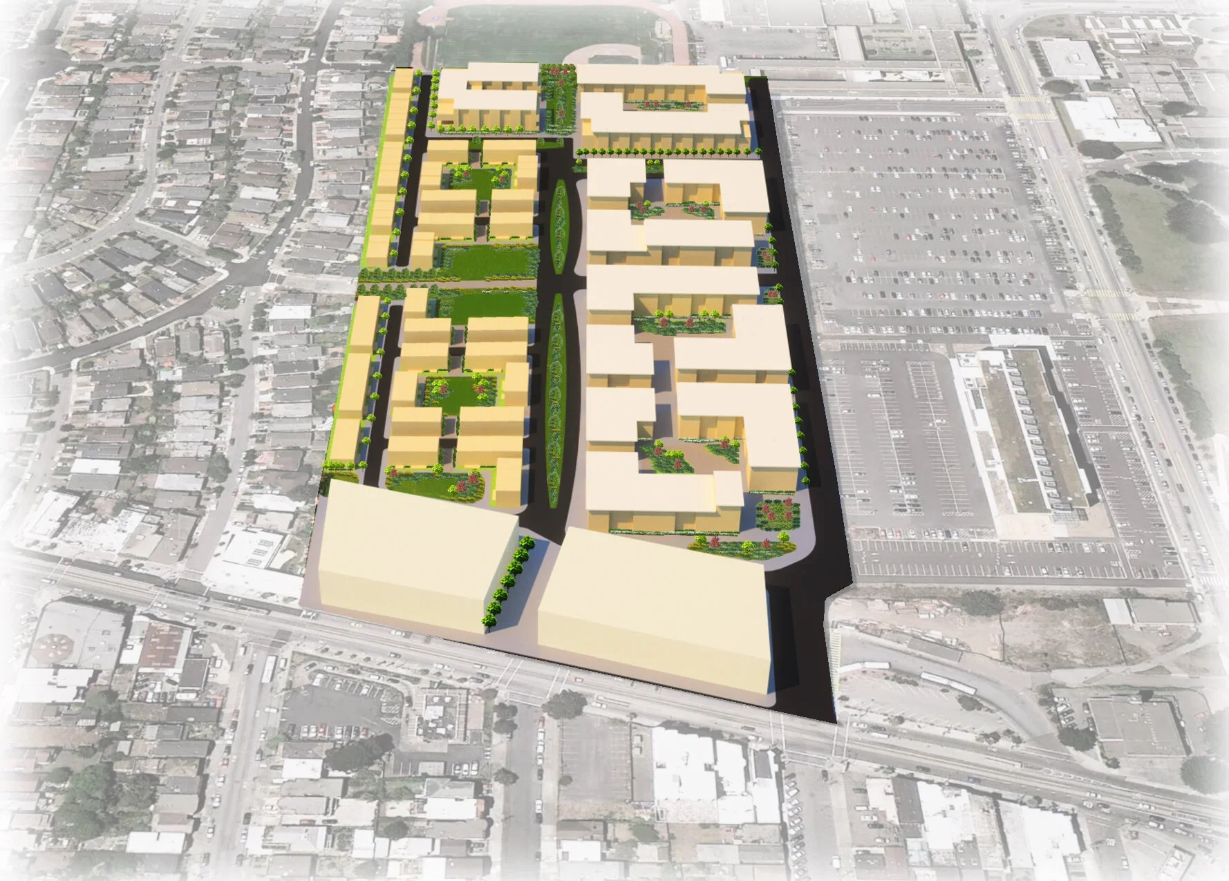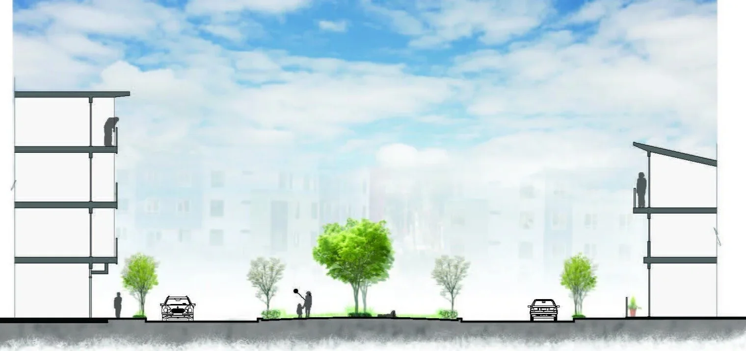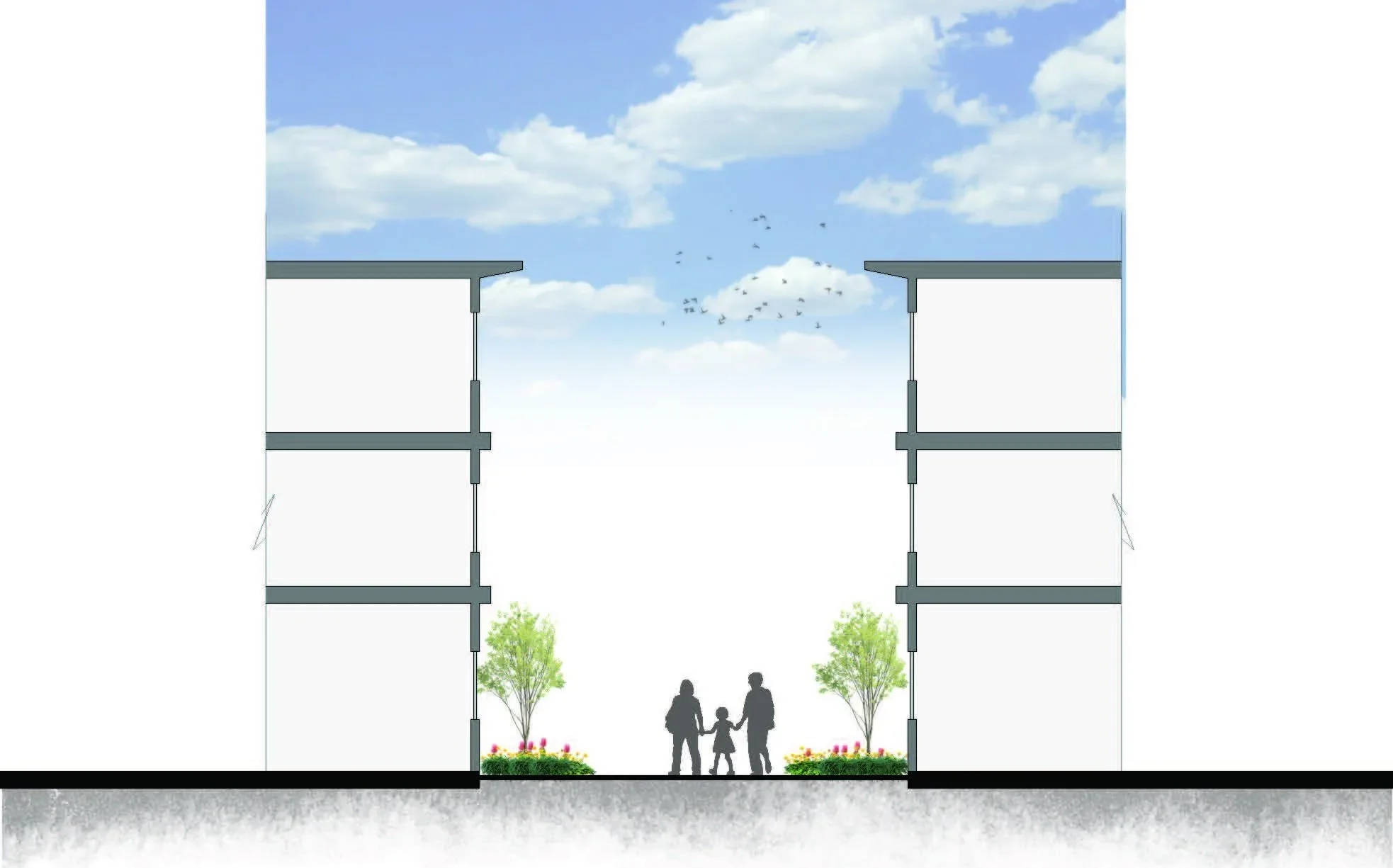 The three segments also allowed us to bridge the diverse neighborhood conditions surrounding the site. With a residential neighborhood the west, a commercial district to the south, and a community college to the east, our site proposal bridges all three urban elements. The town-homes to the east maintain the residential aesthetic while ramping up in density to the multi-family housing to the west. The student housing at the north of the site abuts playing fields. Commercial development at the south edge of the site fronts the commercial district and creates a stepped-down separation between commercial and residential uses.