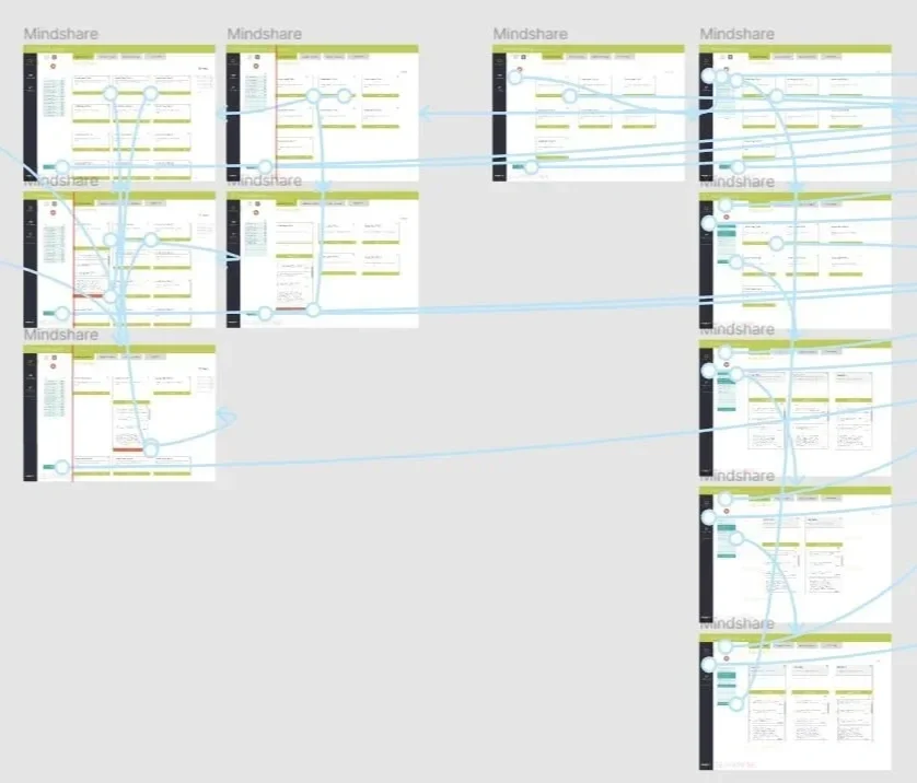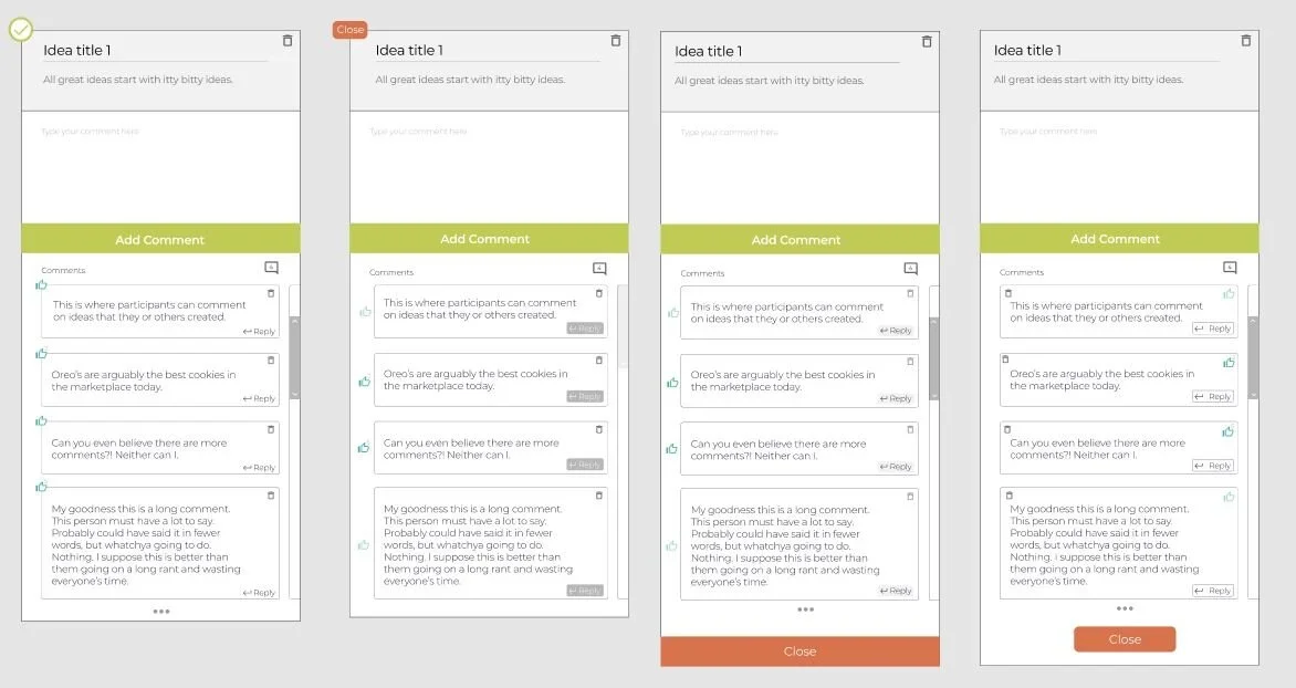 Mid-process wireframes and prototypes of Mindsharing components. The left image shows how the user would interact with the app. Users interact with the app in a myriad of ways, and their journey through the app needed to be intuitive. The right image explores different layouts for the comment boxes. I prioritized simple, intuitive designs utilizing UI best practices.