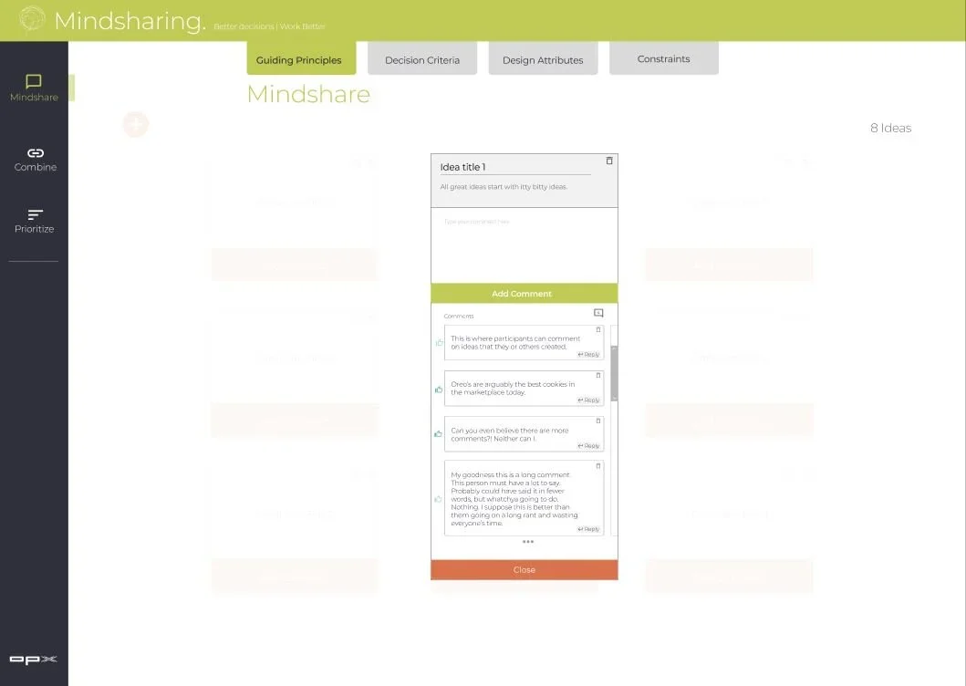 Due to rising subscription costs for third-party software, I designed Mindsharing, an in-house decision-making tool to help facilitate our client-facing Vision Sessions. Mindsharing helps stakeholders ideate, comment on, and reach consensus around important guiding principles and strategic intent. Our Vision Sessions often comprise a diverse mix of leadership and staff, so allowing for anonymous idea generation and commenting ensures all voices are heard. Mindsharing allows each participant to add ideas from their individual computer and instantly view on their screen all ideas that have been added from the group. They can then comment on ideas, reply to comments, and like comments. Participants can then prioritize ideas and Mindsharing produces an aggregate ranking of all ideas