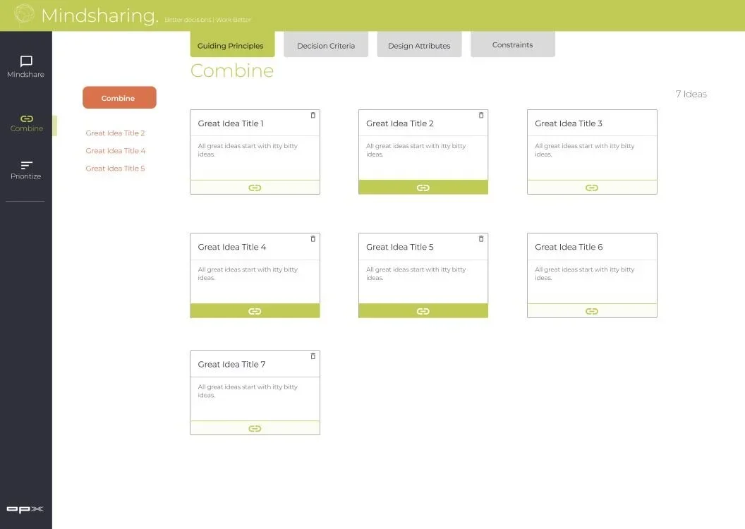 With dozens of ideas flowing in simultaneously, it is inevitable that there will be some duplicate or similar ideas. The facilitator has unique capabilities to combine separate ideas into one unified idea. That combined idea will preserve comments and replies from both unique ideas.